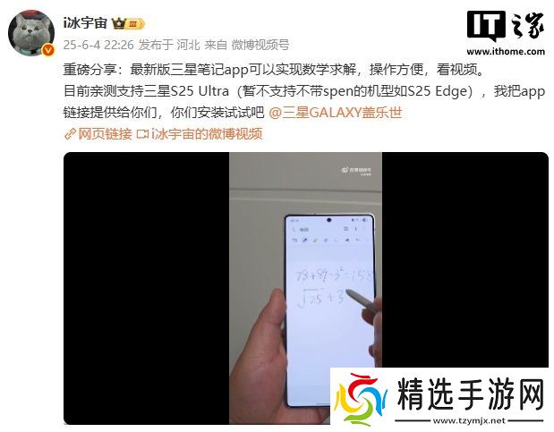 本站 6 月 7 日消息,博主@i冰宇宙 近日分享一项功能:最新版三星笔记 App 可实现数学求解,支持 S25 Ultra 等机型(暂不支持不带 Spen 的机型如 S25 Edge)。