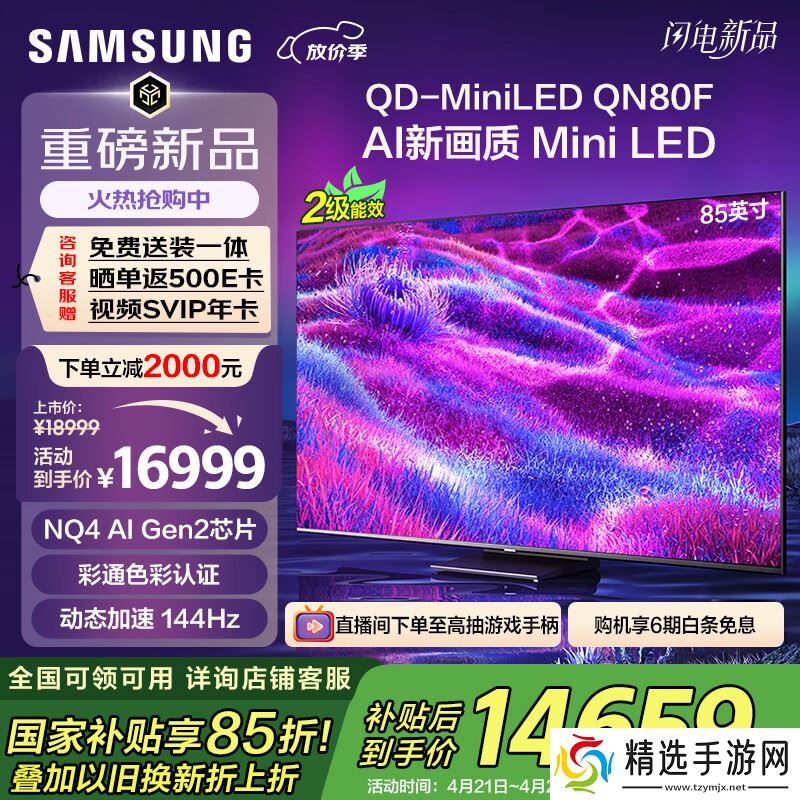 京东三星(SAMSUNG)85QN80F 85 英寸 Neo AI Mini LED 电视 超薄 4K 大屏影院 QA85QN80FAJXXZ 券后 16699 元领 0.95 元券2025 年国补现已正式开始,本站为大家汇总国补领券地址,买数码家电之前记得领取: