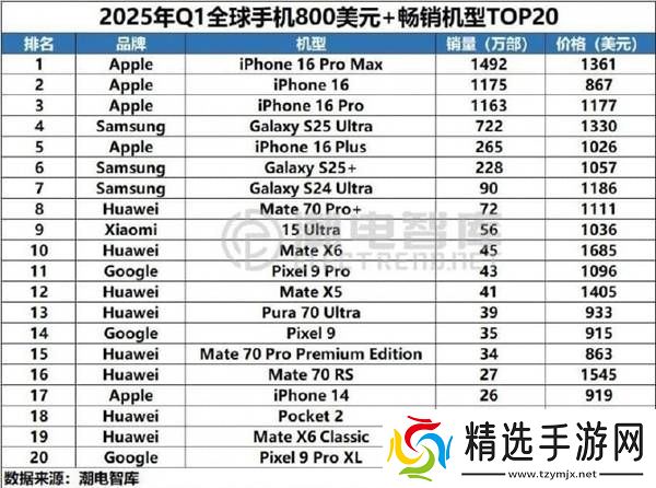 详细数据显示,尽管苹果依旧表现出色,其iPhone 16 Pro Max、iPhone 16和iPhone 16 Pro分别以1492万部、1175万部和1163万部的销量占据了销量前三的位置,但华为的表现同样不容忽视。华为凭借Mate 70 Pro+等高端机型,成功跻身销量榜第八名,该机型销量达到72万部。