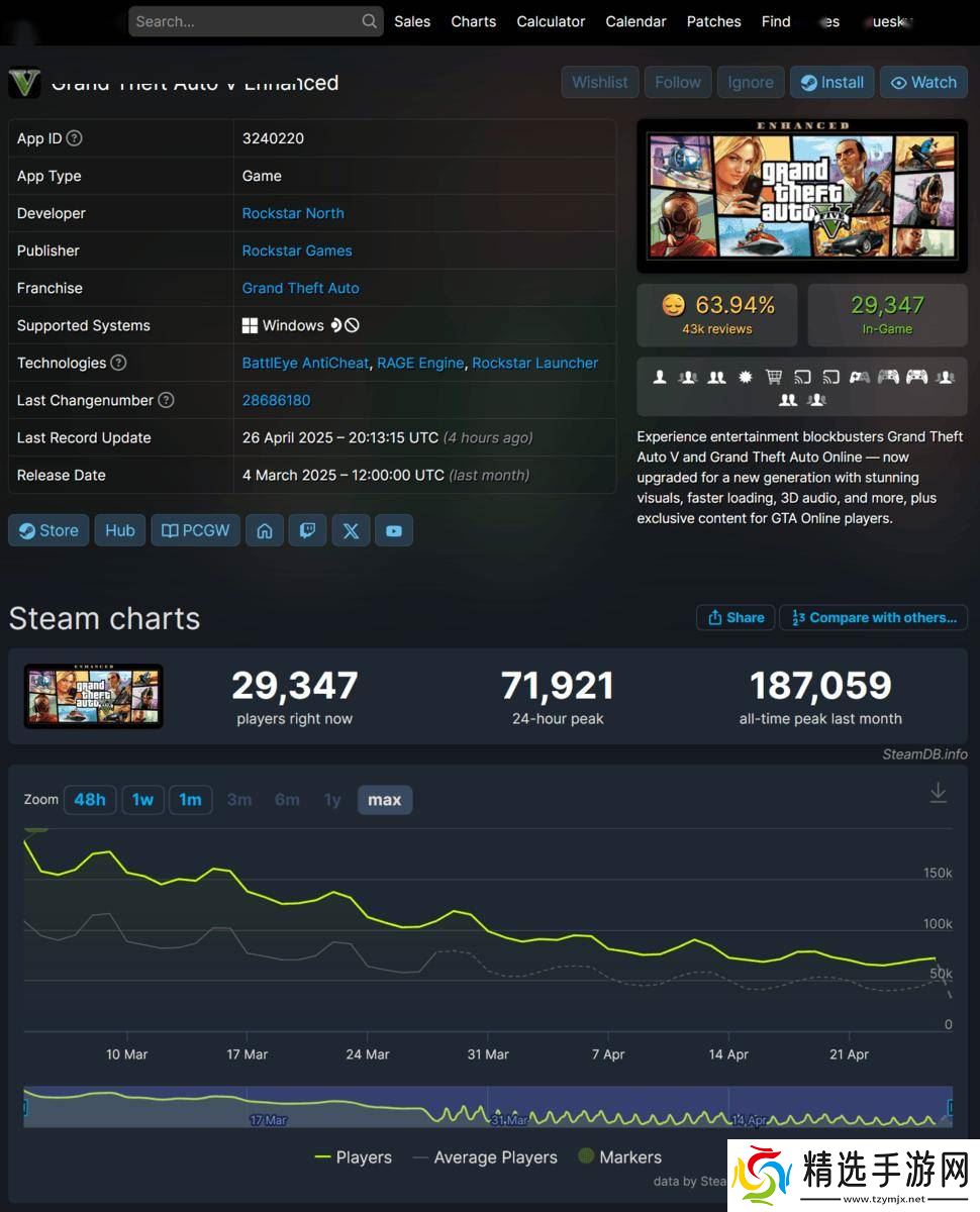 自《GTA 5 增强版》发布以来,尽管它带来了画面质量的显著提升以及更快的加载速度,但并未能如愿吸引大量PC玩家迁移。相反,原版游戏因其广泛的模组支持和稳定的功能表现,持续吸引着玩家回流。SteamDB的数据显示,增强版自首发日的18.7万峰值在线人数后,玩家数量逐渐下滑,目前已跌破7.2万,而原版则依然保有8.62万的活跃玩家。