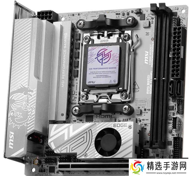 MPG B850I EDGE TI WIFI主板采用了银灰白为主色调,搭配黑色的接口组件,展现出一种简约而不失高端的气质。其正面特别配备了一个主动式风扇散热马甲,专门用于为主M.2插槽(支持PCIe 5.0×4)以及下方的芯片组等关键硬件提供高效的散热解决方案。