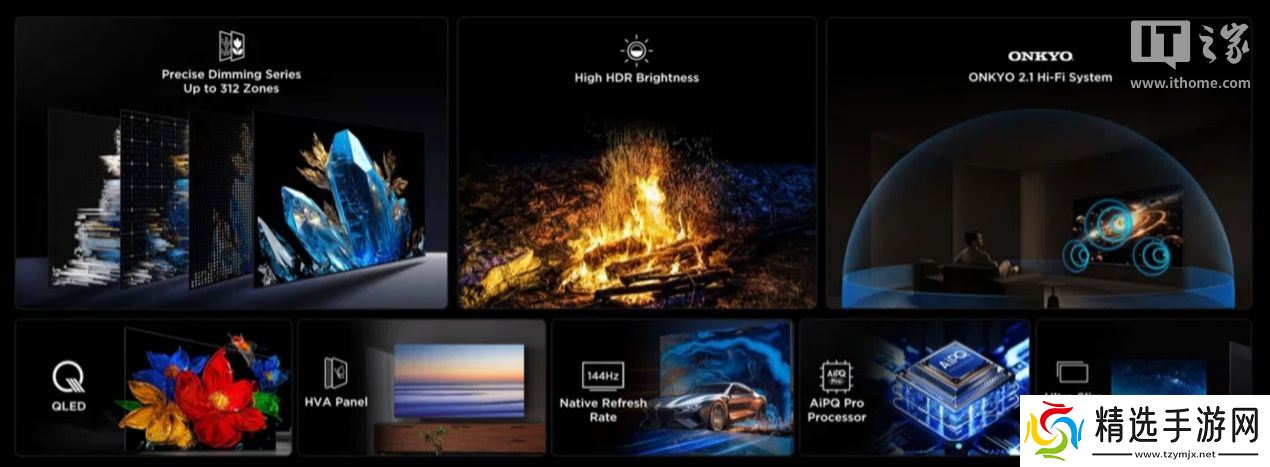 新品支持杜比视界 IQ、HDR 10+、HLG,获 IMAX Enhanced 和莱茵低蓝光认证,配备 AMD FreeSync Premium Pro 防撕裂技术和超宽屏显示等游戏功能。