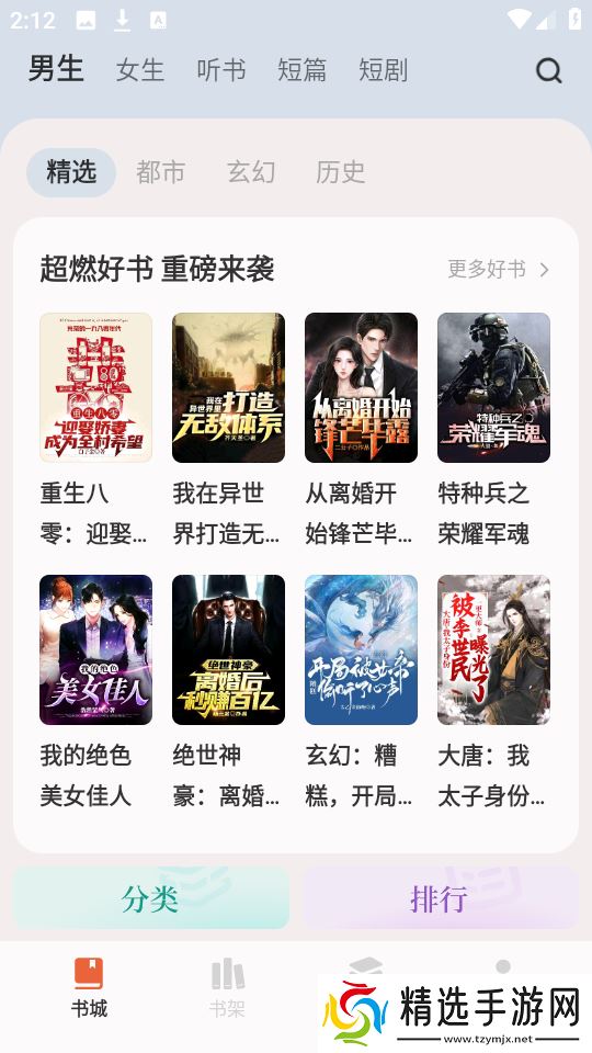 2、首页包含了精选,都市,玄幻,历史等题材的小说。