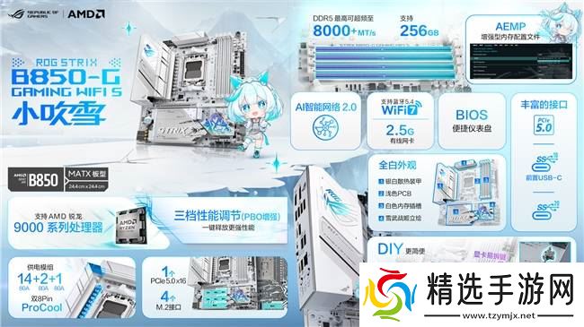 在硬件配置上,ROG B850小吹雪主板采用了14+2+1供电模组(80A),搭配双8Pin ProCool供电接口和8层PCB,能够轻松驾驭AMD锐龙9000系列处理器。同时,其供电区和芯片组区均配备了厚实的银白散热片,有效降温。内存方面,通过AMD EXPO和AEMP技术,该主板支持高达DDR5 8000+(超频)的内存频率。主板还提供了三档性能调节(PBO增强),一键解锁温度墙,为玩家带来更好的温度和性能表现。在存储方面,板载4个M.2接口,其中一个位于主板背面,并配备了M.2快拆装甲和便捷卡扣设计,方便玩家装卸SSD设备。同时,该主板还支持PCIe 5.0规格显卡,并配备了显卡易拆键,预装一体化I/O背板,拥有丰富的USB接口,满足玩家高速扩展的需求。网络方面,板载2.5G有线网卡并支持WiFi7,搭配雪武战姬主题银白易拆式天线,为玩家带来流畅的网络体验。
