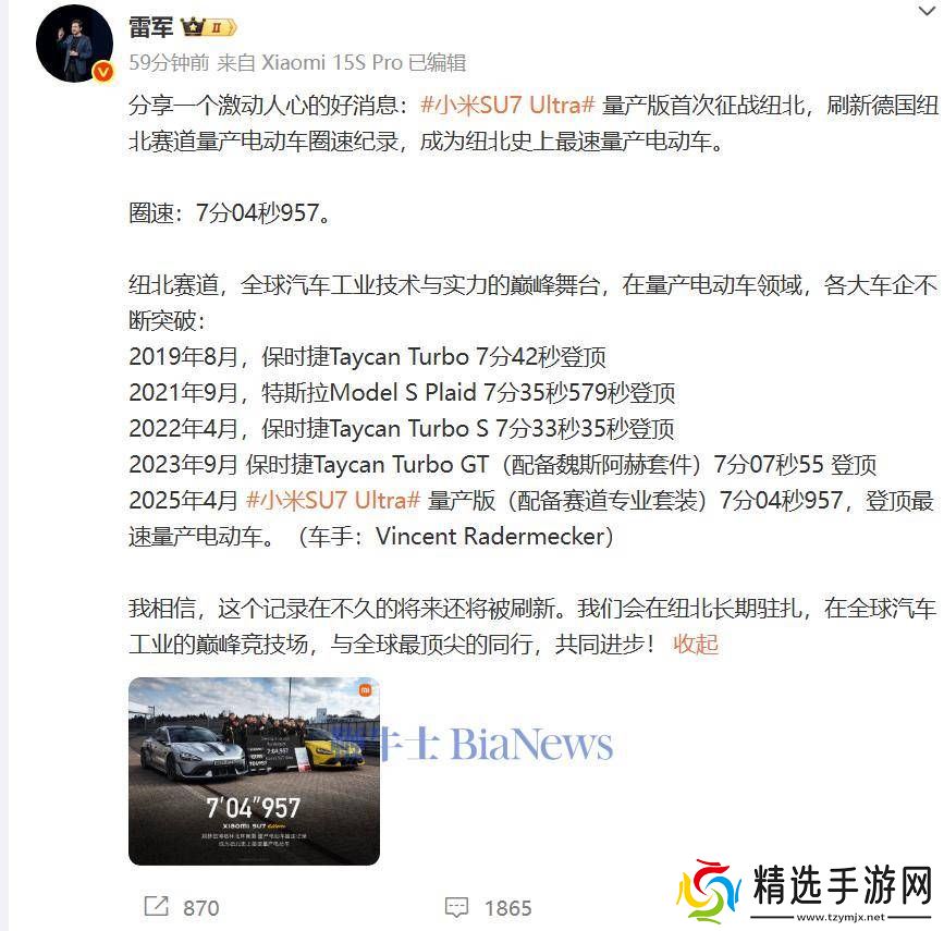雷军近日宣布了一项令人振奋的成就:小米SU7 Ultra量产版在德国纽伯格林北环赛道(纽北)上创造了新的量产电动车圈速纪录,正式加冕纽北史上最速量产电动车的桂冠。