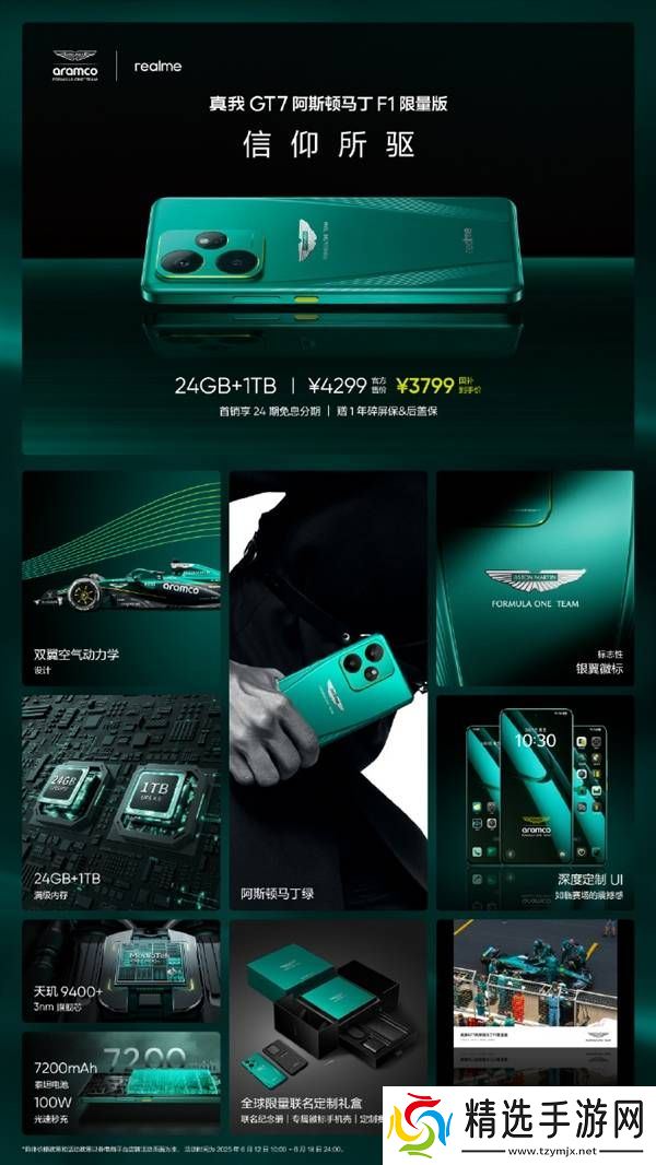 阿斯顿马丁沙特阿美F1车队与真我品牌携手,推出了全球首款联名智能手机——真我GT7阿斯顿马丁F1限量版,并于近日正式上市。这款特别版手机的售价为4299元,经过国家补贴后,消费者可以以3799元的价格入手。