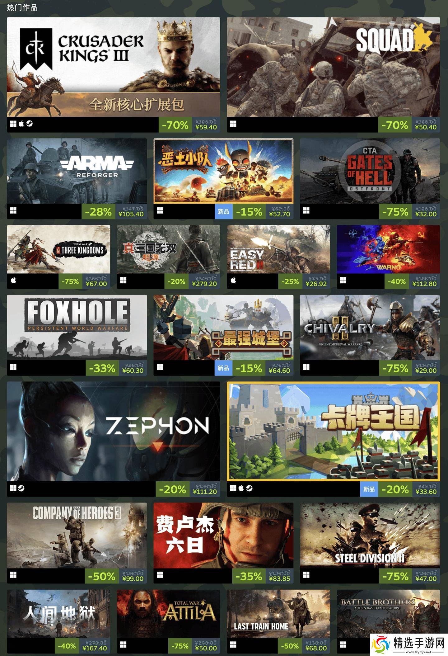 除了上述佳作,还有更多精彩游戏等待着玩家的发掘。《全面战争:幕府将军 2》原价223元,现2.5折特惠,只需55.75元即可体验古代日本的战争风云。《Crusader Kings III》这款深度策略游戏,原价198元,现在三折优惠,仅需59.4元。《Call to Arms - Gates of Hell:Ostfront》则以2.5折后的32元,为玩家带来二战东线的残酷战斗体验。