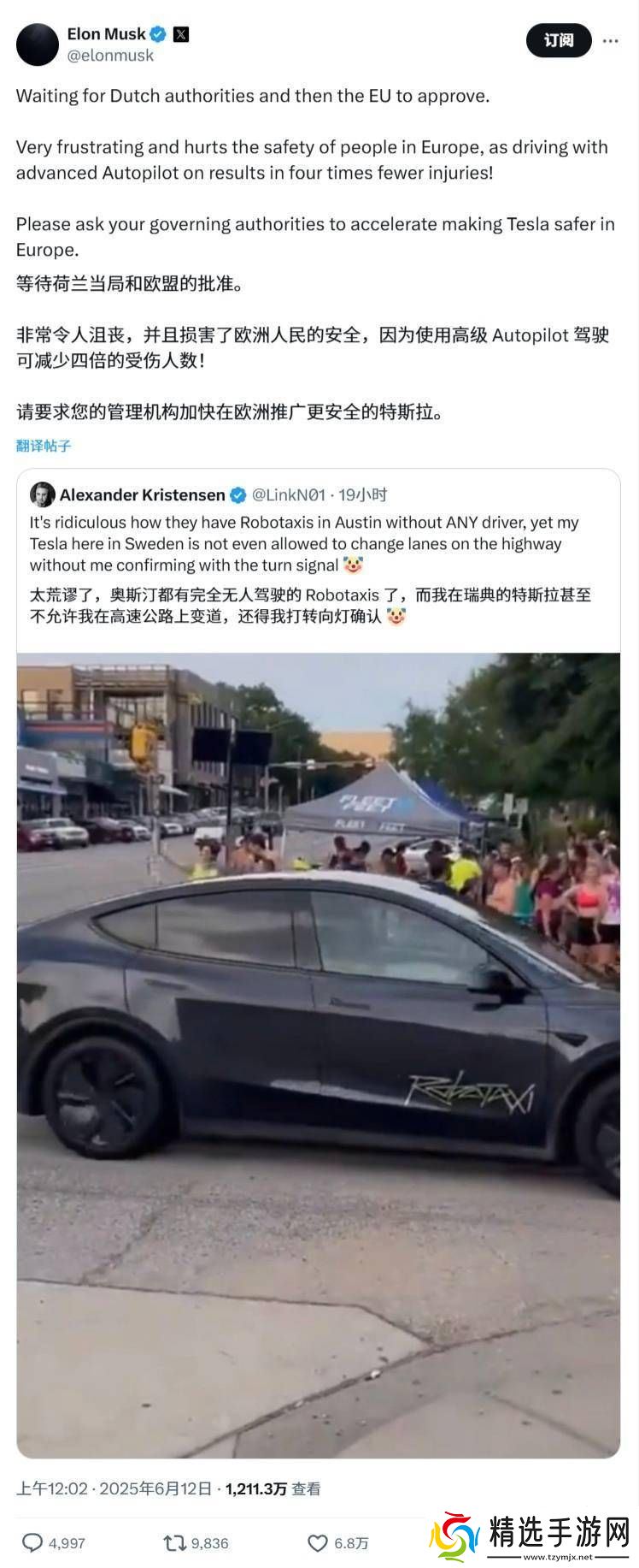 马斯克在X社交平台上表示,特斯拉目前正在焦急等待荷兰监管机构和欧盟的批准。他直言不讳地指出,长时间的审批过程“令人深感沮丧”,甚至可能“对公众安全构成威胁”。他进一步强调,启用特斯拉的高级自动驾驶系统可以显著降低驾驶中的受伤风险,具体而言,受伤几率可减少四倍。为此,马斯克呼吁特斯拉用户向本国监管部门施加压力,以加快审批流程,使特斯拉在欧洲的道路上行驶更加安全。