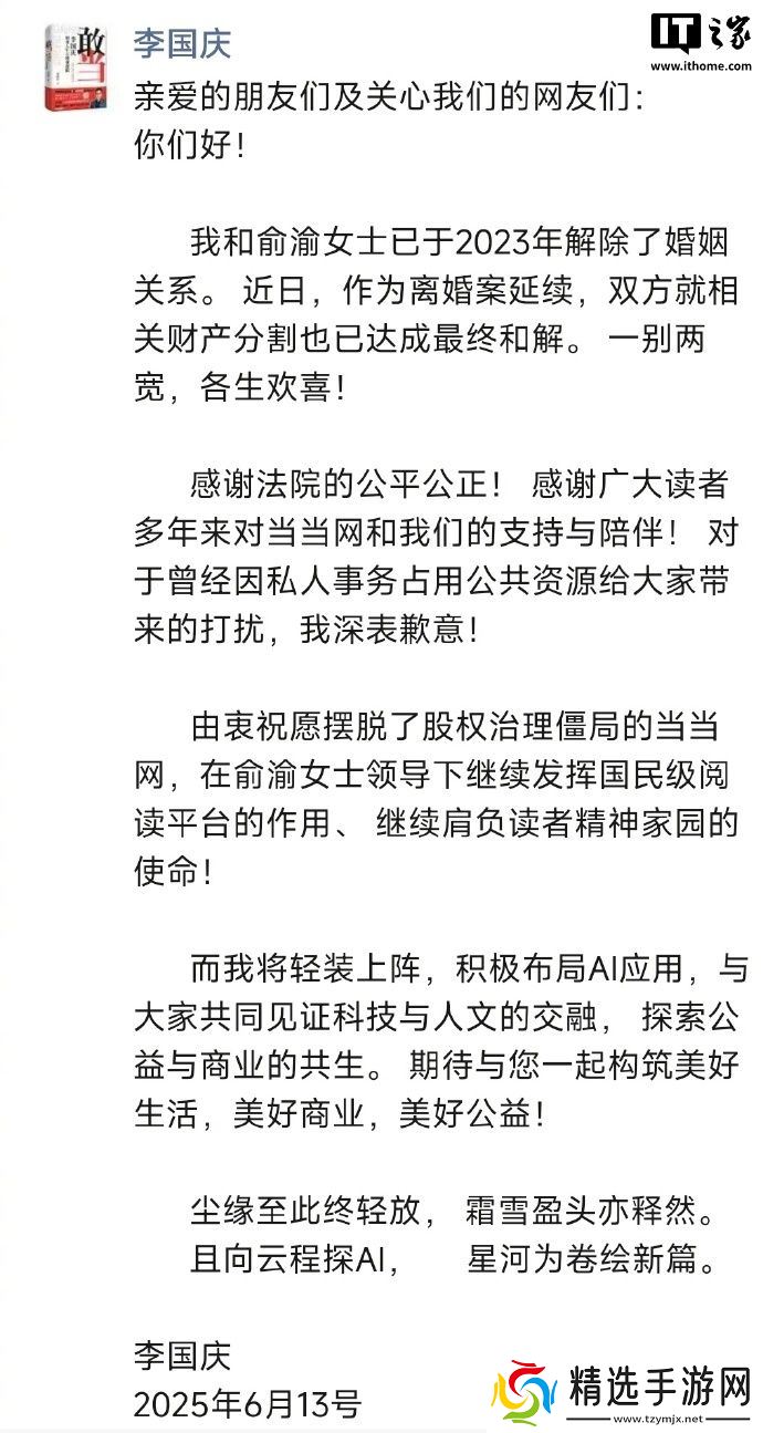 本站 6 月 13 日消息,当当网创始人李国庆今日宣布和俞渝女士已于 2023 年解除了婚姻关系。近日,作为离婚案延续,双方就相关财产分割也已达成最终和解。此外,他还宣布将积极布局 AI 应用。