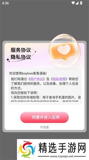 boylove漫画怎么用1、打开从本站下载的app,阅读服务协议与隐私协议,同意并进入应用。