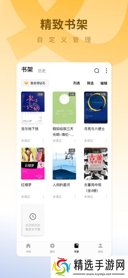 2.云书架书籍阅读记录云端同步,连载书籍章节快速更新,还有多套惊艳的书架皮肤供你选择。