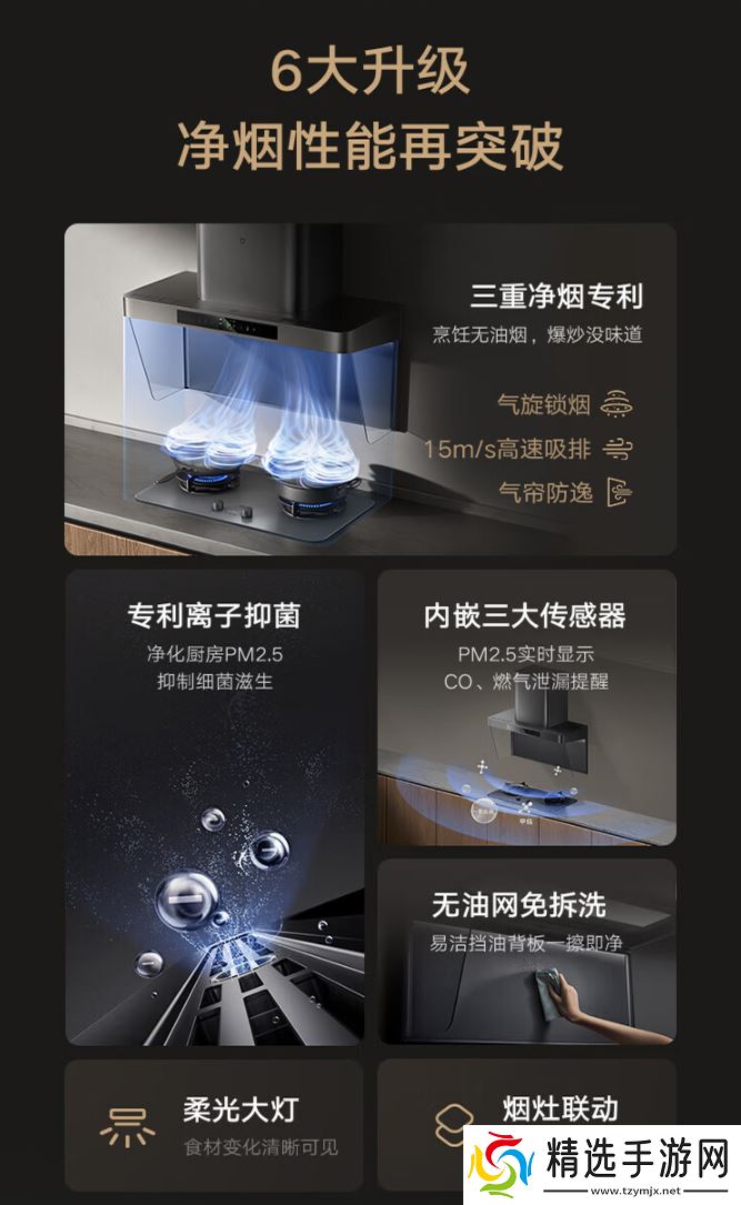 这款产品具备一字型吸风口,支持 1100Pa 静压自动巡航,可提供 15m/s 高速后倾气流,风速较前代产品增强 25%;支持双防逸气帘、四涡捕集气旋,在锅具上方形成四涡气旋,从源头锁住油烟、PM2.5 等有害微粒。