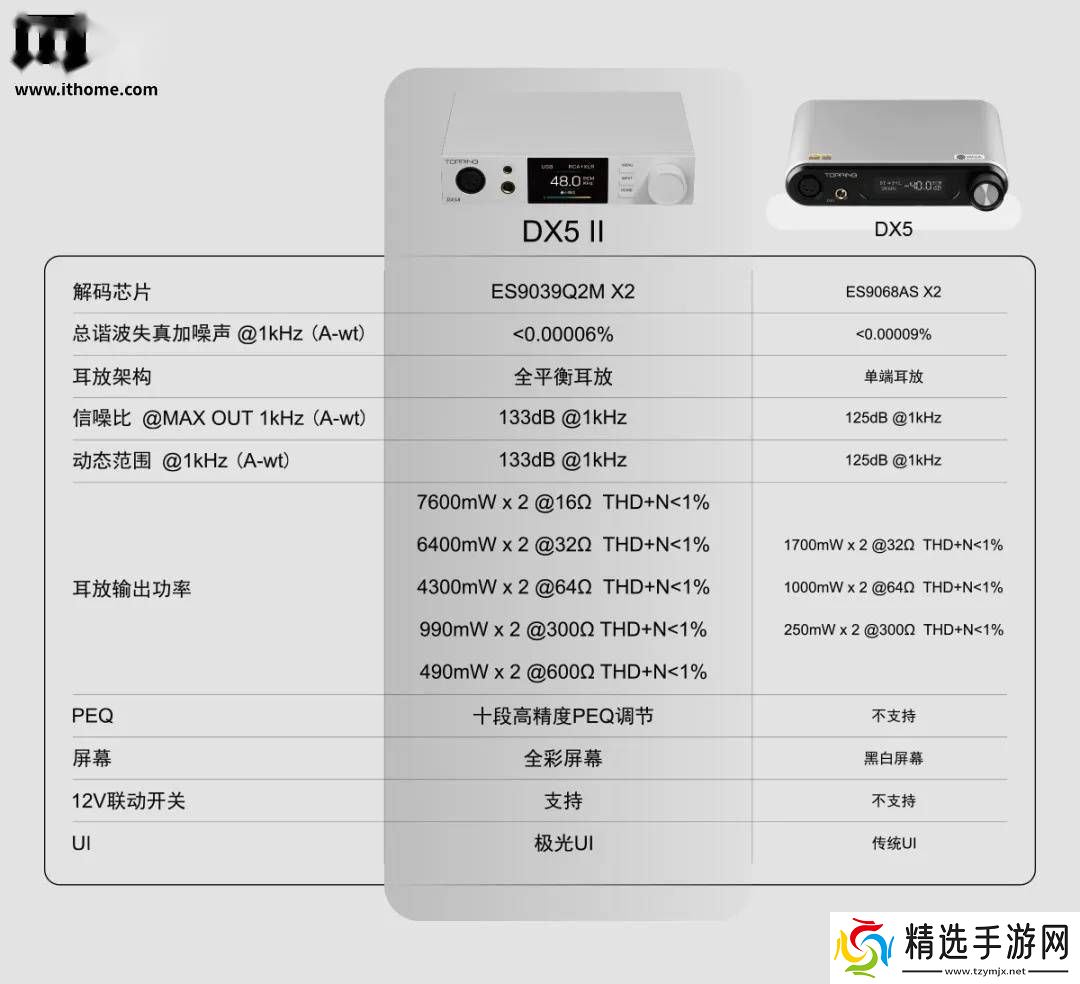 为了更直观地展示DX5 II与前代产品DX5的差异,官方还提供了详细的参数对比图。从图中可以看出,DX5 II在多个关键性能指标上均有显著提升,无疑是音频爱好者们的不二之选。