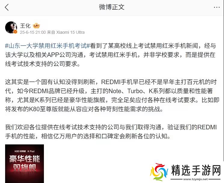 针对这一事件,小米集团公关部总经理王化迅速作出回应。他表示,经过与相关方面的沟通了解,山东科技大学考试禁用红米手机的规定并非学校本身的要求,而是由提供在线考试技术支持的公司所提出的。