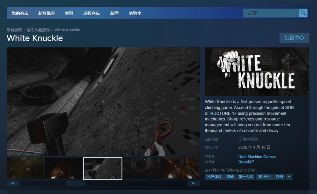 Steam平台需要先安装Steam平台,之后注册一个账号登录,然后搜索“White Knuckle”进入商店购买页面。