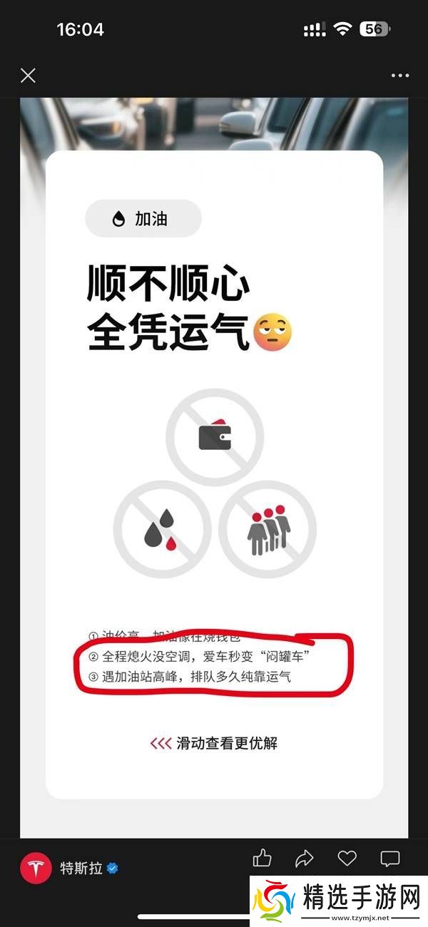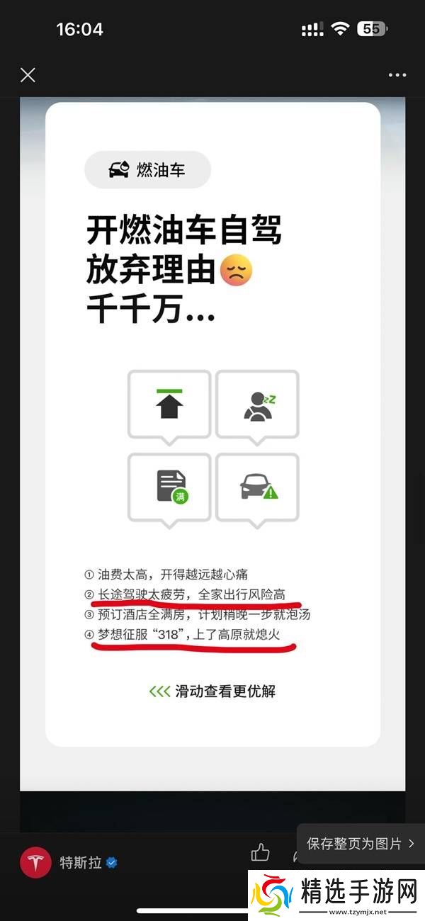 海报中,特斯拉列举了燃油车加油时的几大不便之处,如油价高昂、加油过程中车辆熄火无法使用空调,导致车内如同“闷罐”、以及加油站高峰时排队等待时间的不确定性。特斯拉以此为对比,突出了其电动车的诸多优势,如辅助驾驶功能被称为“高速神器”、后排座椅可迅速放倒变身“大床房”、电动车无惧高原反应,能轻松行驶在川藏线等。