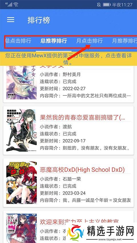 1、打开轻小说文库app,进入小说排行榜界面,左右滑动上方分栏可看到包括总点击排行、总推荐排行、月点击排行、月推荐排行等排行类型,用户可选择相应的类型,这里以【月点击排行】为例。