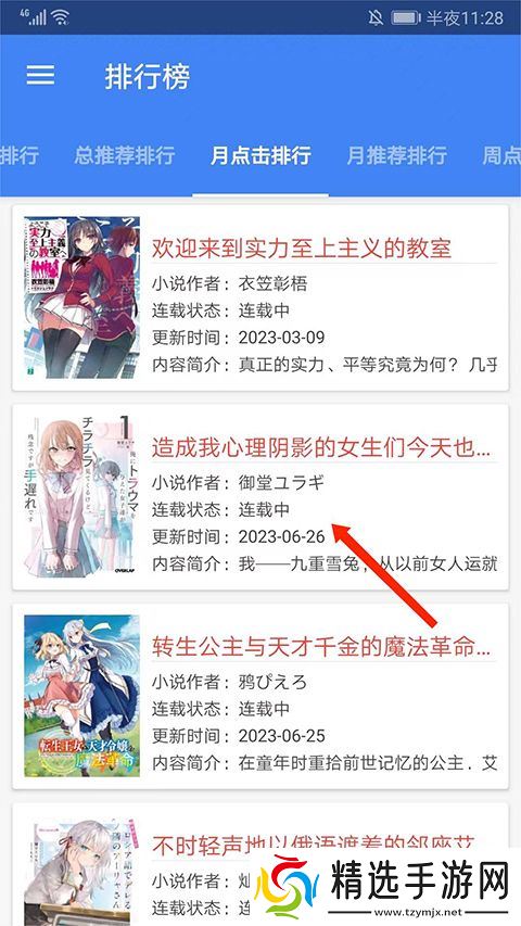 2、进入月点击排行界面,选择想看的小说,以第二个为例。