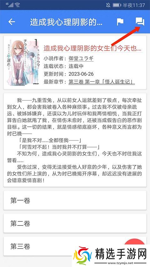 6、返回小说主页,选择右上角【对话框】图标可以进入小说的评论区,查看书友们的留言评论,帮助你更真实地了解这部小说,以上就是轻小说文库的使用方法了。