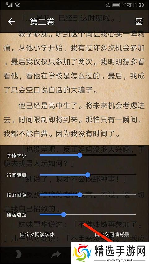 4、进入阅读界面,选择右下角【三个点】图标,用户可进行字体大小、行间距离、段落间距、段落边距以及背景的设置。