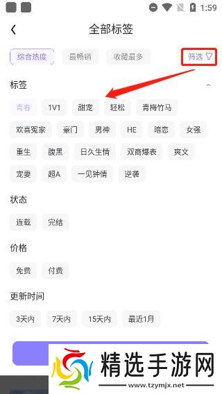 3、例如选择【青春】题材的小说,点击右方筛选还可添加如【1v1】、【甜宠】或【轻松】等更多的标签以更准确地定位。