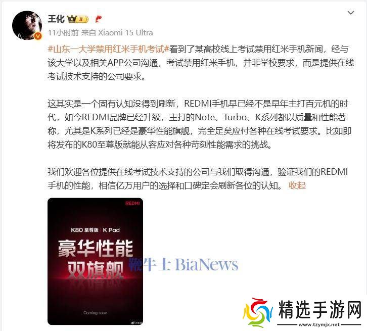 近期,关于山东科技大学本科综合评价招生面试的一项特别规定引发了广泛讨论——红米系列手机被明确禁止作为考试设备使用。这一争议迅速引起了小米集团的关注,尤其是其公关部总经理王化的积极回应。