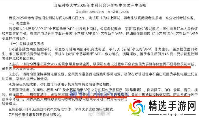 事件的起因是一张网友分享的截图,内容来自山东科技大学2025年本科综合评价招生面试的考生须知。该须知详细列出了线上面试的技术要求,包括主机和辅机均需保证至少20G的可用存储空间,以避免因空间不足导致的录制中断。然而,在诸多技术细节中,最后一条关于禁用红米系列手机的规定尤为引人注目。