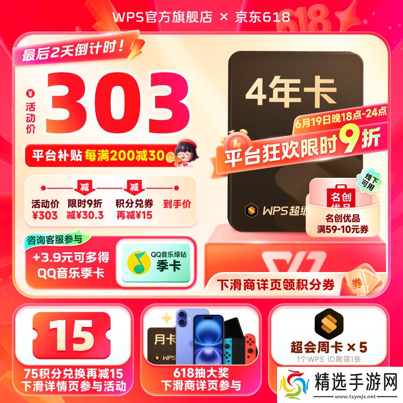 WPS 超级会员 4 年卡日常大促价 333 元,618 返场今晚 18 点起直降至 303 元。