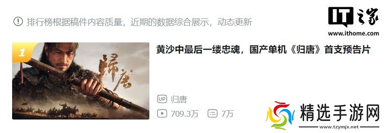 本站 6 月 20 日消息,国产动作冒险单机游戏《归唐》今日上午发布了第一条预告 PV,瞬间成为单机游戏玩家关注的热点,登上B站全站排行榜第一名,并入选了“第 326 期每周必看”名单。