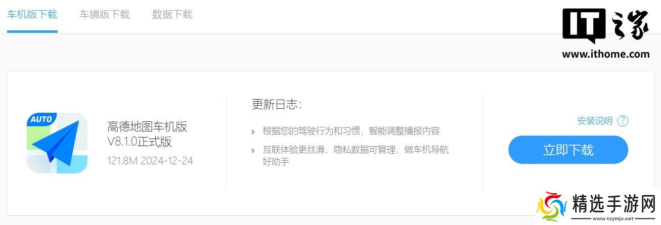 高德地图车机版官网显示公众版本最新正式版为 8.1.0,于 2024 年 12 月 24 日发布更新,可根据用户的驾驶行为和习惯智能调整播报内容。