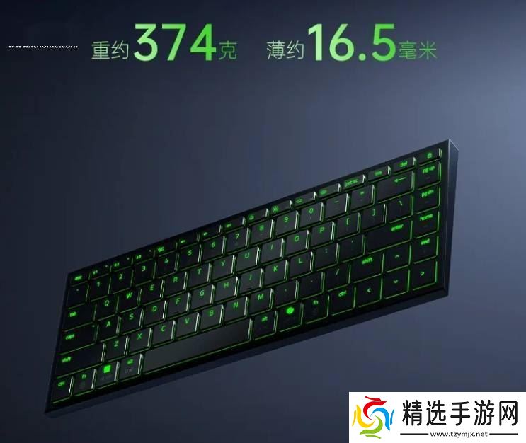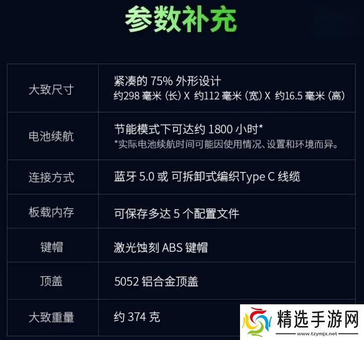 这款键盘以其独特的黑绿配色设计脱颖而出,简约而不失时尚感。其75%的紧凑布局不仅节省了桌面空间,更赋予了键盘一种精致的美感。同时,约374克的重量与16.5毫米的轻薄机身设计,使得长时间使用也不会感到疲惫。