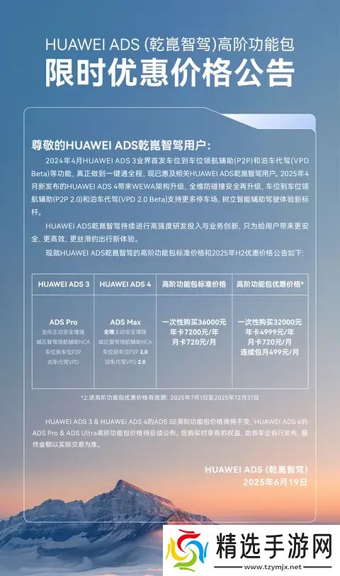同时,华为 6月 19 日在正式公布 ADS(乾崑智驾)高阶功能包限时优惠价格,为华为 ADS 3 和 ADS 4 的高阶功能包提供不同的购买选项,其中高阶功能包一次性购买 32000 元,年卡 4999 元 / 年,月卡 720 元 / 月,相应优惠价格有效期为 7 月 1 日至 12 月 31 日。