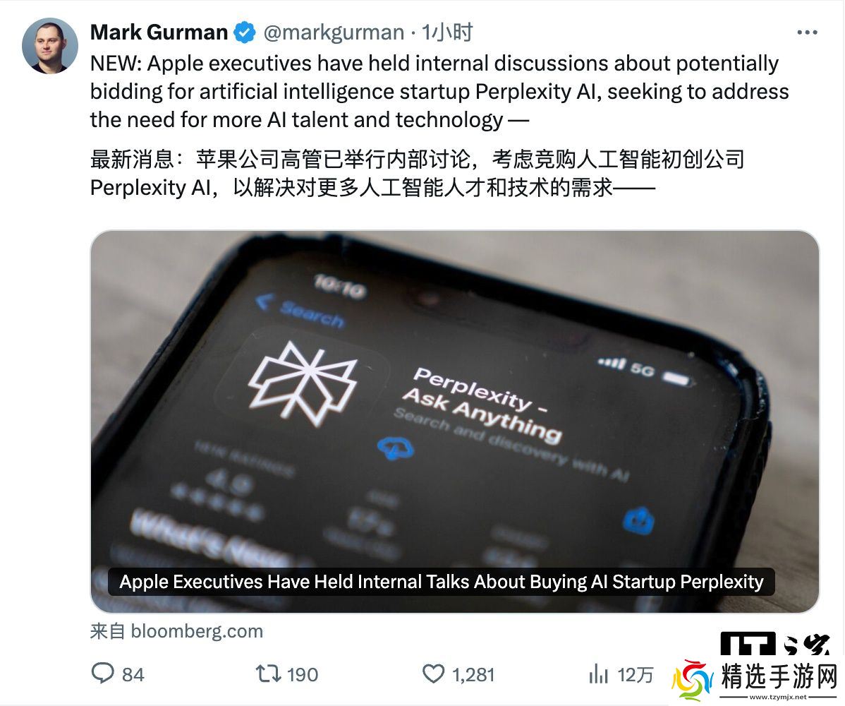 本站 6 月 21 日消息,彭博社记者马克・古尔曼今天清晨撰文称,苹果公司正考虑收购 AI 初创企业 Perplexity AI,以补强公司在 AI 领域的人才和技术储备。