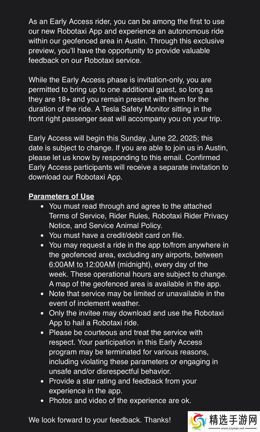 本站援引博文介绍,根据邀请函和部分公布的条款,早期测试阶段仅限受邀用户参与,测试车辆为无人驾驶的 Model Y,运行时间为每天 6 点至午夜,且仅限于特定地理围栏区域。
