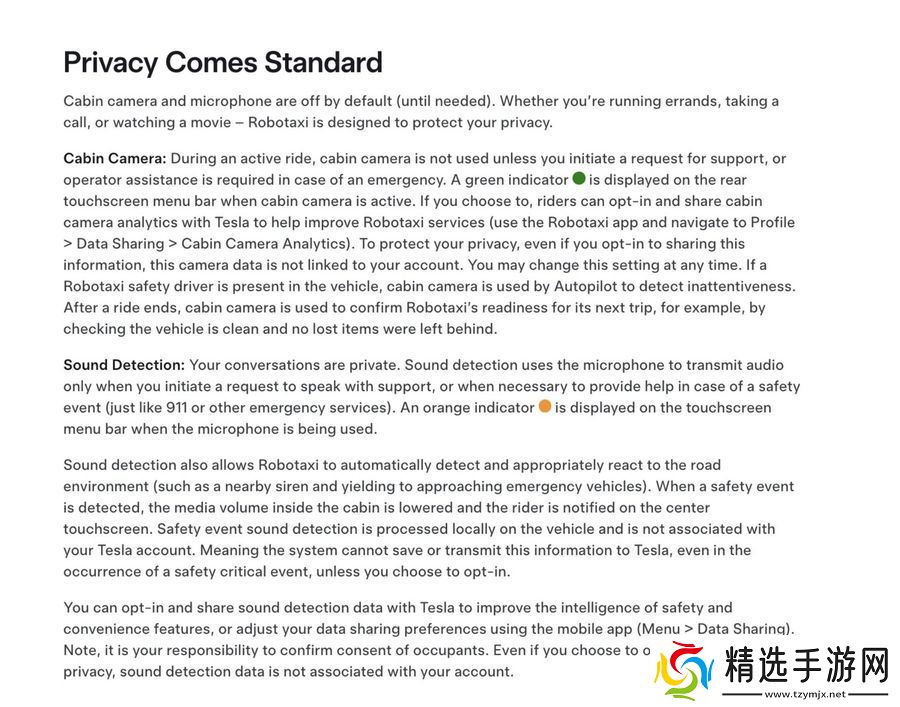 此外,特斯拉还承诺在恶劣天气下暂停服务,并保证车内摄像头仅在乘客求助时开启。车内麦克风则会持续运行,以便检测紧急车辆的警笛声,在用户需要联系平台客服或拨打 911 情况之外,不会将声音传输至特斯拉服务器。