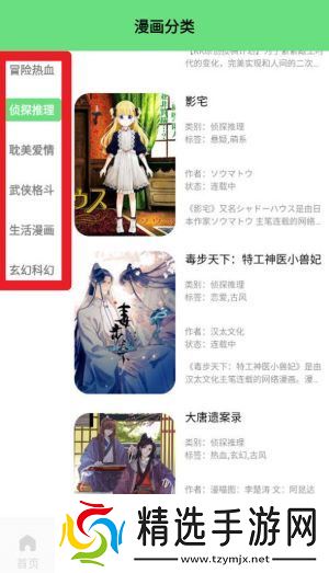 2、来到分类的页面中可以通过漫画的类型,在冒险热血、侦探推理、耽美爱情、武侠格斗等分类查看。