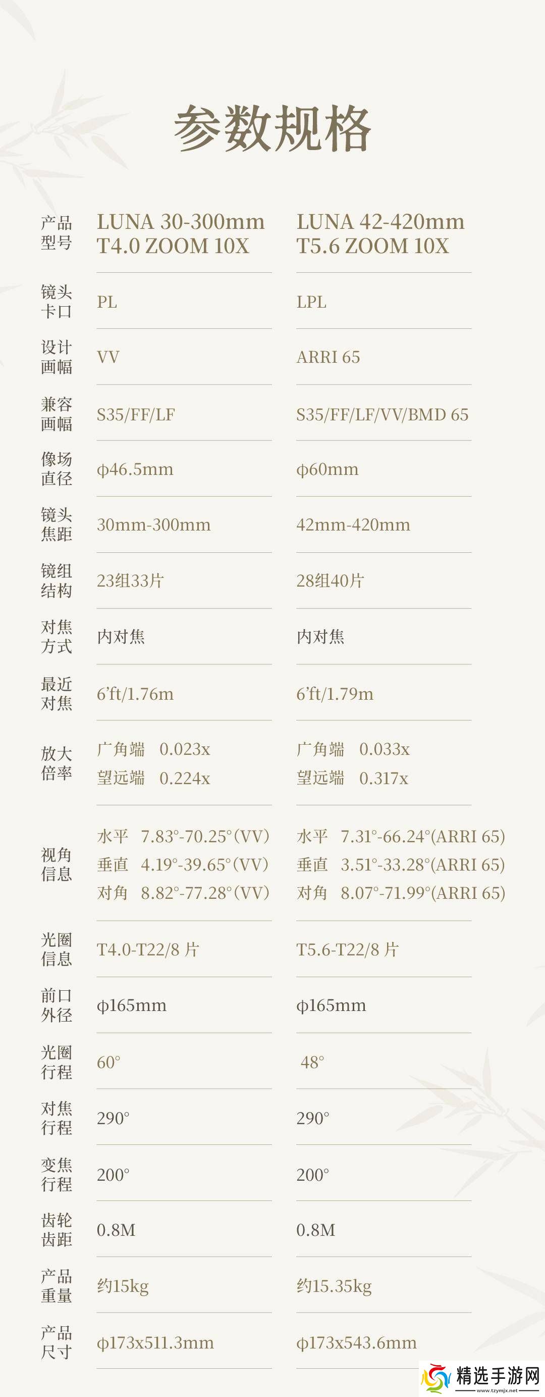 其中一款镜头是30-300mm T4.0 ZOOM 10X PL,它拥有全程恒定的T4.0最大光孔,像圈直径达到Φ46.5mm。这款镜头不仅覆盖了从30mm到300mm的焦段,还首次在国内实现了FF(全画幅)、LF(大画幅)以及VV(超大画幅)的10倍变焦能力。无论是经典视角的叙事、中焦的过渡还是长焦的特写,这款镜头都能轻松应对,为拍摄者提供了丰富的景别选择。