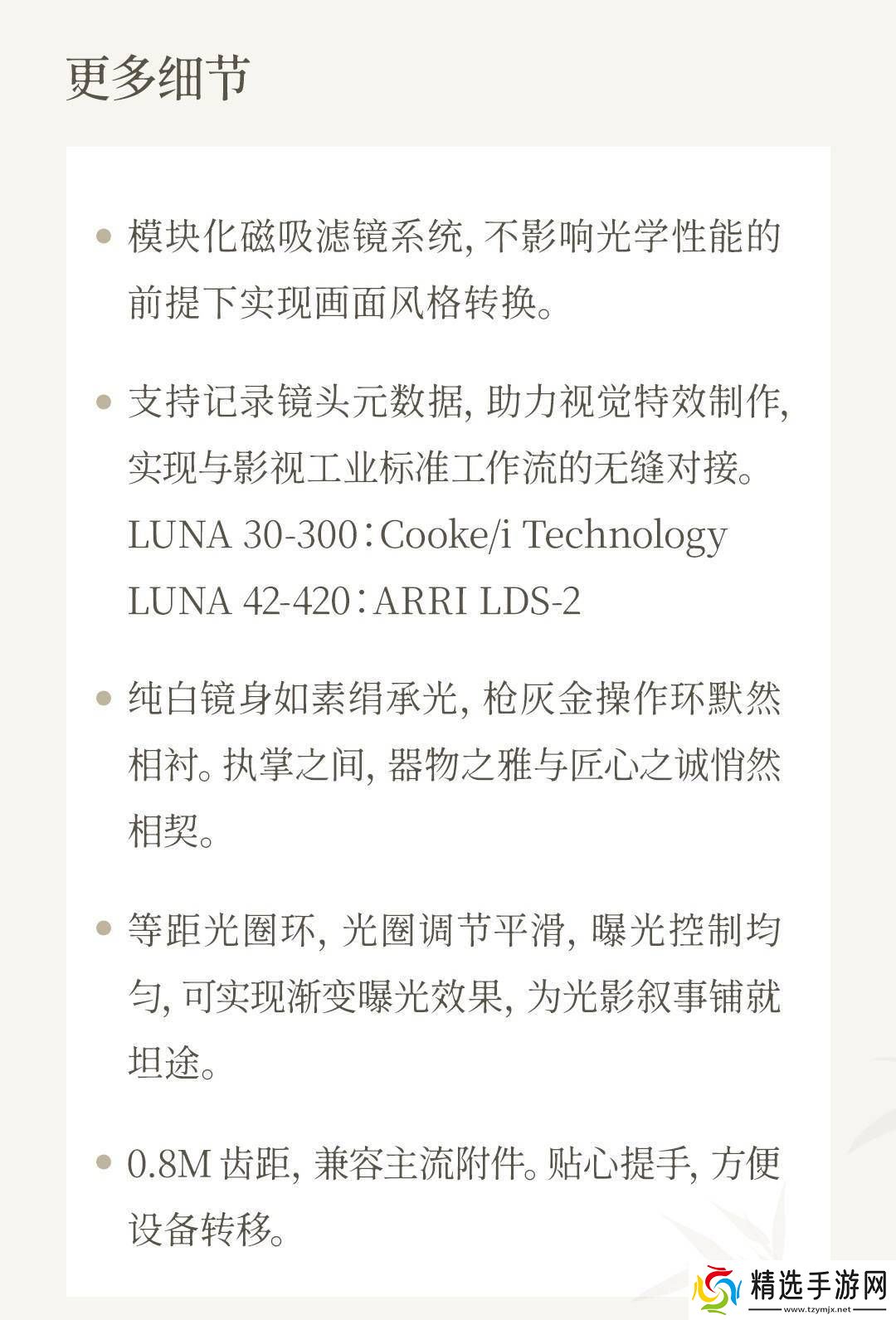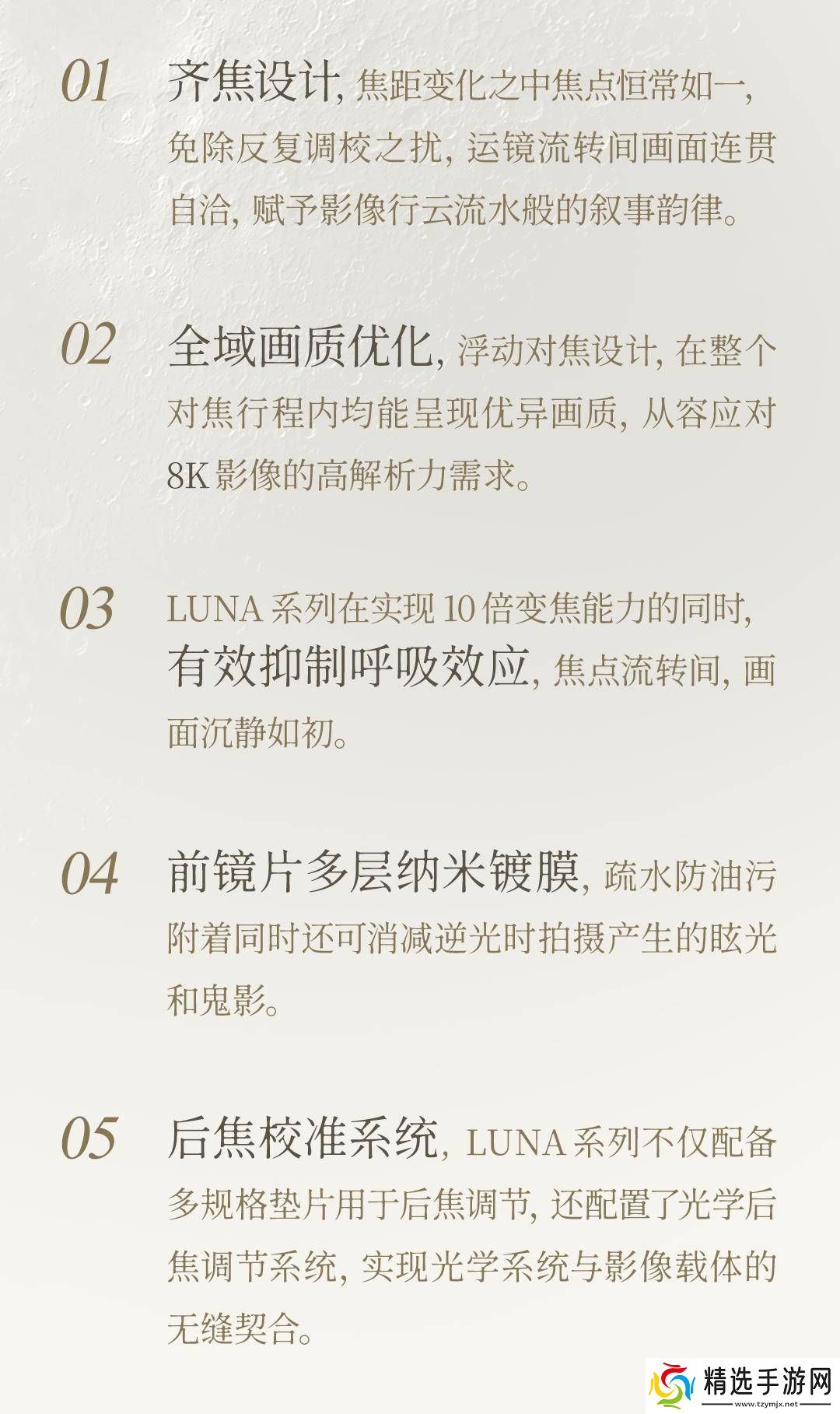 这两款镜头在设计上均采用了齐焦设计,确保在焦距变化时焦点保持不变,大大节省了拍摄时的调校时间。同时,它们还采用了全域画质优化和浮动对焦设计,确保在整个对焦行程内都能呈现出优异的画质,满足8K影像的高解析力需求。LUNA系列在实现10倍变焦的同时,还成功抑制了呼吸效应,使得拍摄画面更加稳定。