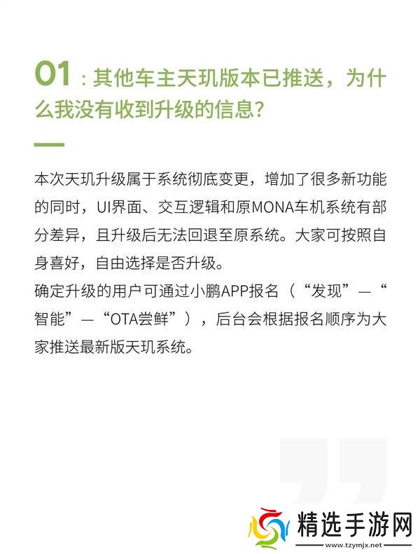 据小鹏汽车介绍,天玑系统的升级是一次全面革新,不仅新增了多项功能,而且在UI界面和交互逻辑上也与原有的MONA车机系统存在显著差异。值得注意的是,一旦完成升级,用户将无法回退到旧系统。因此,小鹏建议用户根据自身喜好和需求,慎重决定是否进行升级。