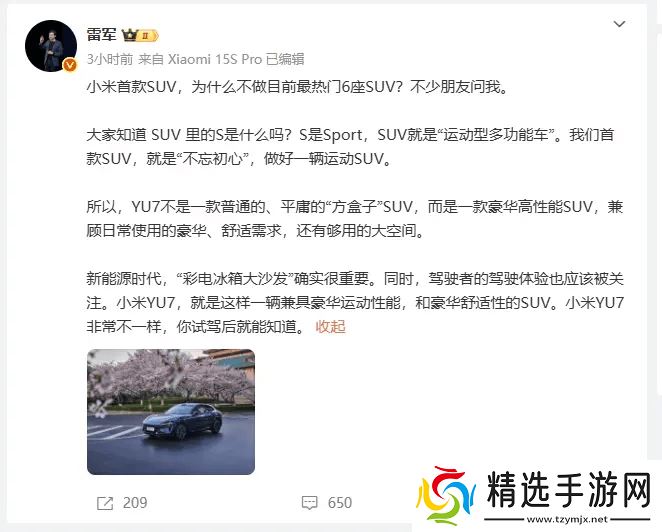 小米汽车的首款SUV车型YU7近日成为了网络热议的焦点,尤其是关于其为何未选择热门6座布局的问题。对此,小米创始人雷军亲自在微博上发表了看法,为公众揭开了YU7的神秘面纱。