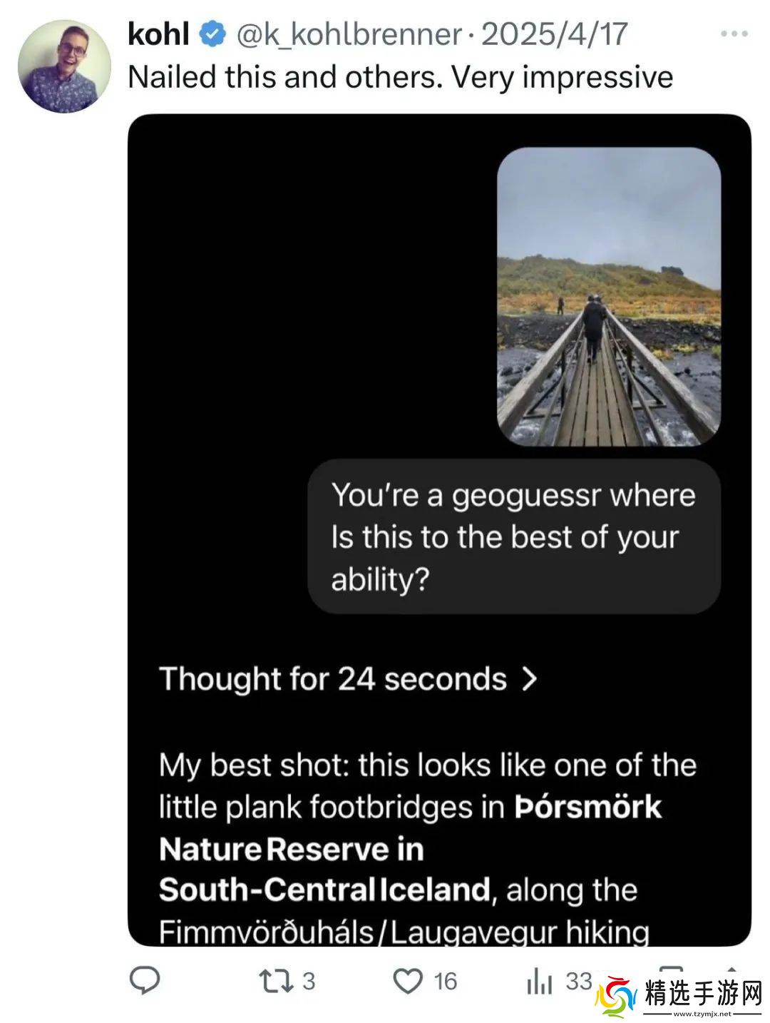 除了萌宠和旅行,AI还在其他领域展现出了强大的实力。在X平台上,一款名为o3的AI工具引发了广泛关注。不少博主上传自己的真实旅行照片用来测试o3的地理位置识别能力,结果惊人地发现,o3的识别准确率极高,甚至能够识别出从未在互联网上公开发布过的照片拍摄地点。这种科幻般的剧情让X平台上的网友们纷纷惊叹不已,也让GeoGuessr这款经典游戏焕发了新的生机。