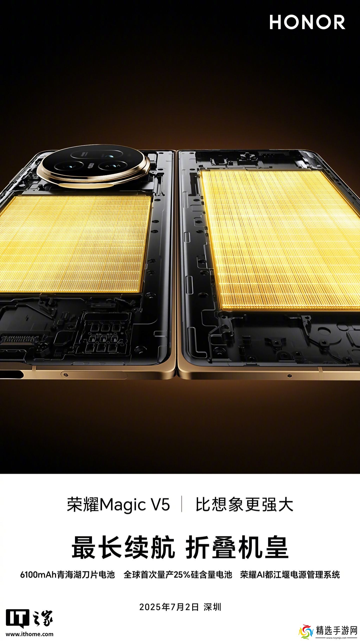 另外,荣耀手机官微今日官宣,Magic V5 新机搭载 6100mAh 超薄青海湖刀片电池,实现了全球首次量产 25% 硅含量。同时,其内置荣耀 AI 都江堰电源管理系统,号称“最长续航折叠机皇”。