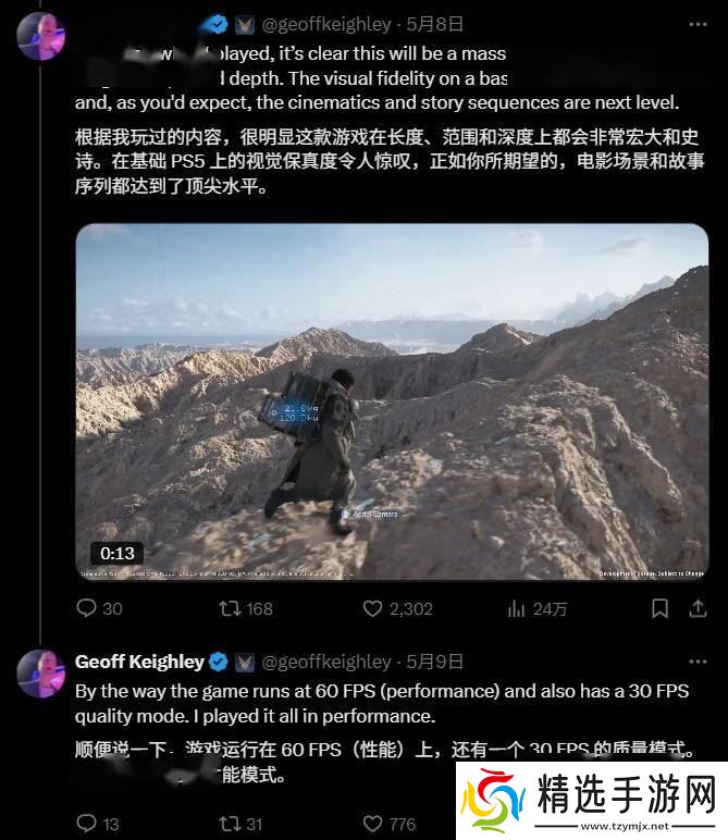 知名游戏行业人士Geoff Keighley在X平台上分享了试玩体验,他透露,在性能模式下,游戏能以流畅的60帧/秒运行,而画质模式则锁定在30帧/秒,他个人更倾向于性能模式带来的顺滑体验。
