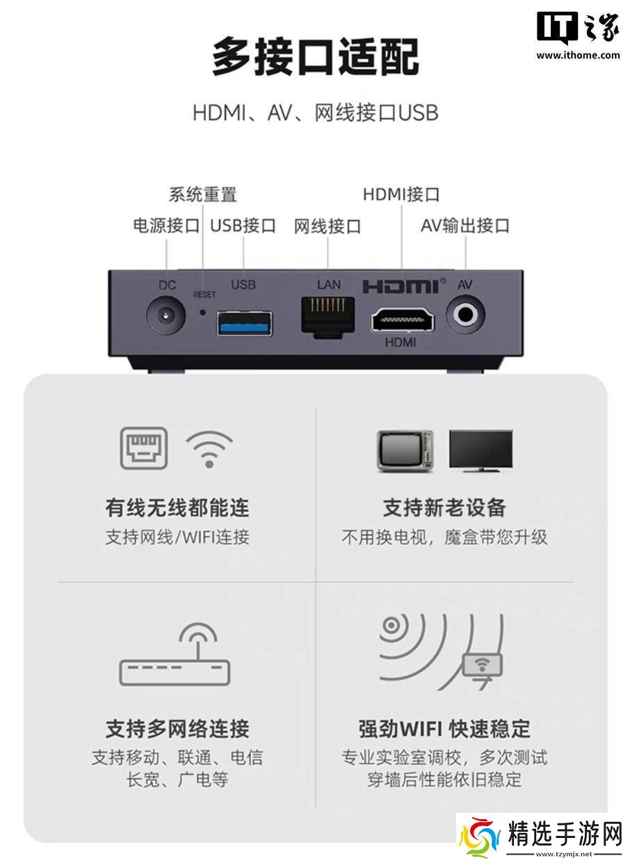 接口方面,天猫魔盒8升级版在后侧配备了USB-A 2.0接口、RJ45网口、HDMI 2.0接口以及AV接口,满足了用户多样化的连接需求。无论是连接外接存储设备、有线网络还是显示设备,都能轻松实现。
