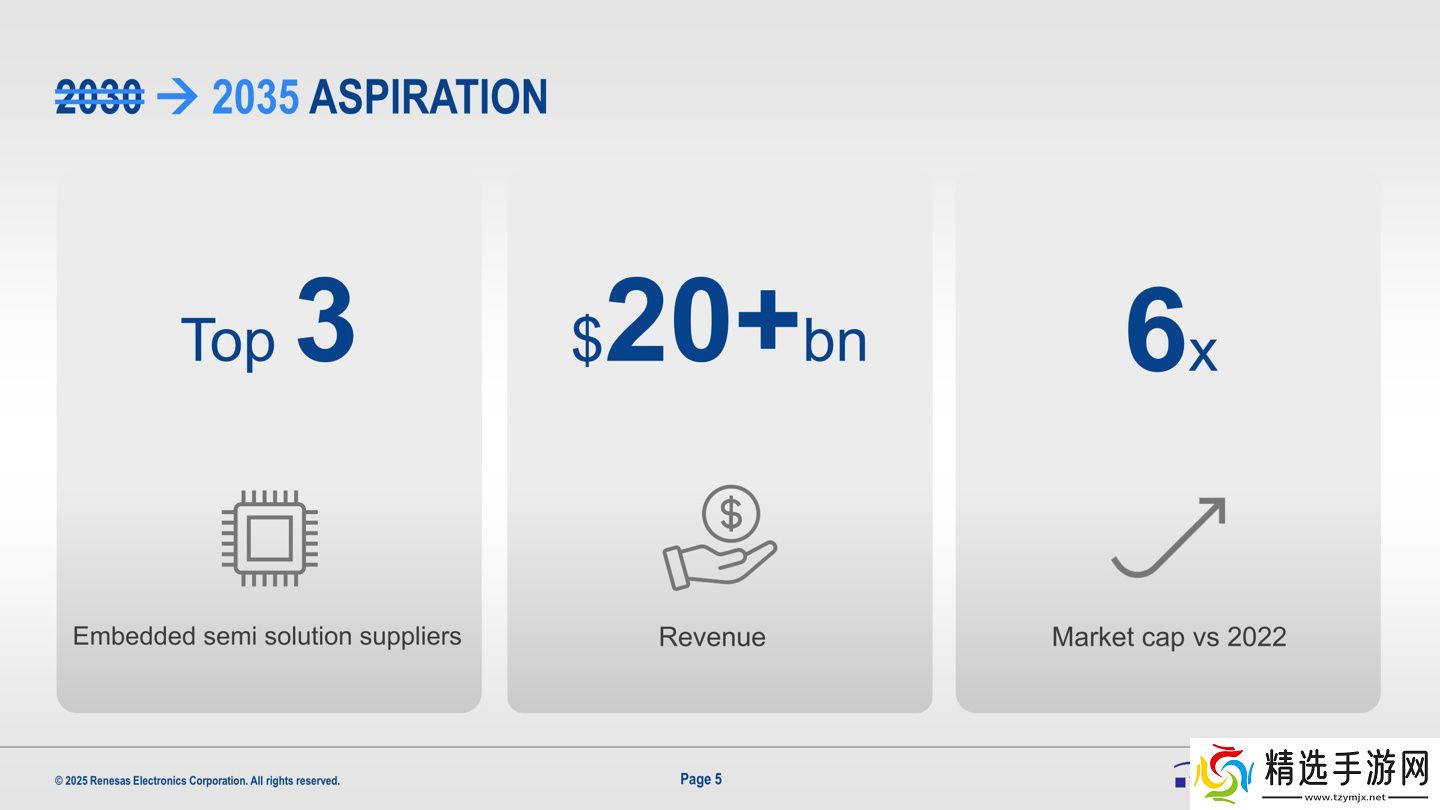 本站 6 月 27 日消息,日本瑞萨电子当地时间昨日举行了本年度的资本市场日(投资者日)活动。而在配套的演示文稿中瑞萨将其到 2030 年实现 200 亿美元(本站注:现汇率约合 1432.75 亿元人民币)以上年营收、市值达 2022 年六倍的目标延后至 2035 年。