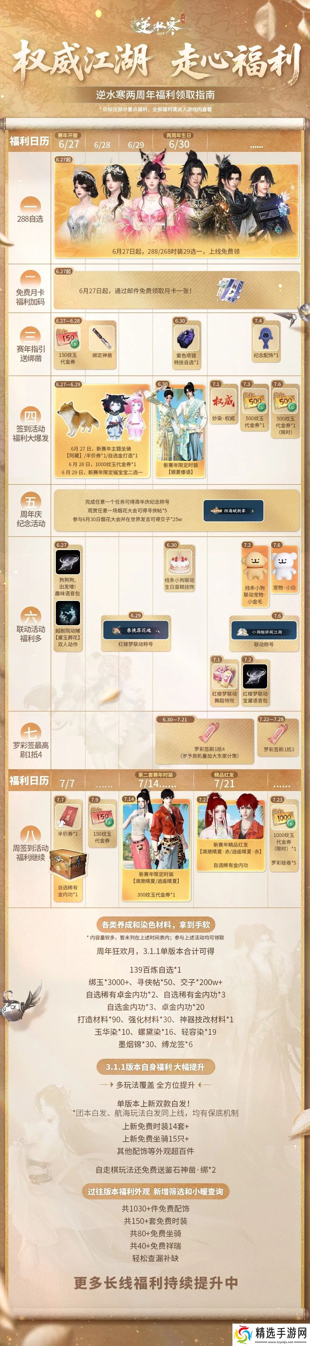 2025 年 6 月 27 日更新后,玩家可登录游戏查看邮箱,领取专属赠礼:免费月卡 * 1、歌曲・逆水寒二周年版、寻侠帖 * 10、绑玉 * 1500。
