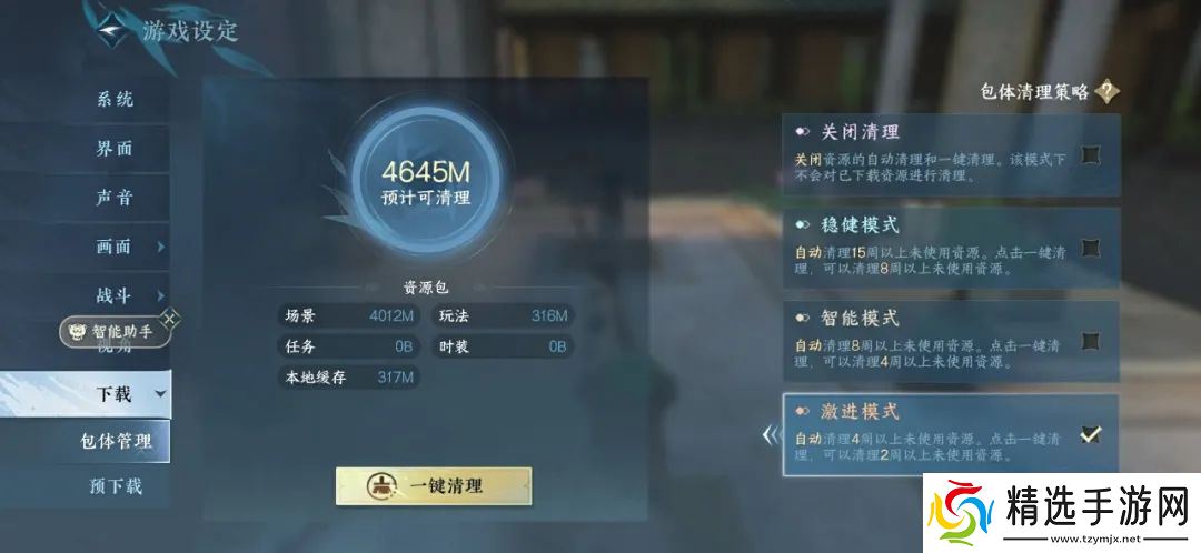 2、新增【极致清理】功能,对部分需要对存储空间进行极致清理的玩家,可将清理模式调整至【激进模式】,同时点击一键清理,可一键删除游戏内所有往期内容(含场景,剧情,玩法,时装等),不影响当前赛季体验。同时清理完成后可将模式切换为其他模式,不会再下载相关内容。