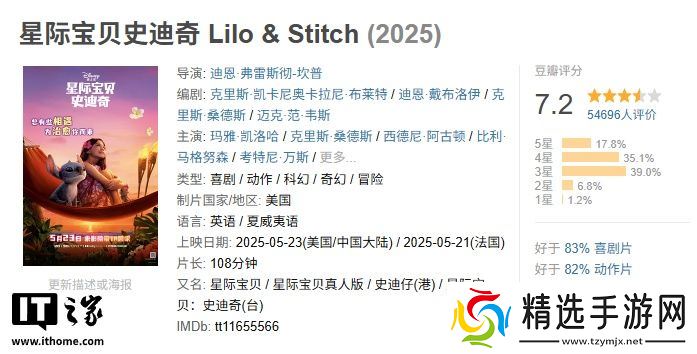 这部迪士尼真人电影在豆瓣的评分为 7.2 分,其中 17.8% 五星好评,35.1% 的四星评价,39% 的三星评价,6.8% 的二星评价,还有 1.2% 的观众给出了一星评价。