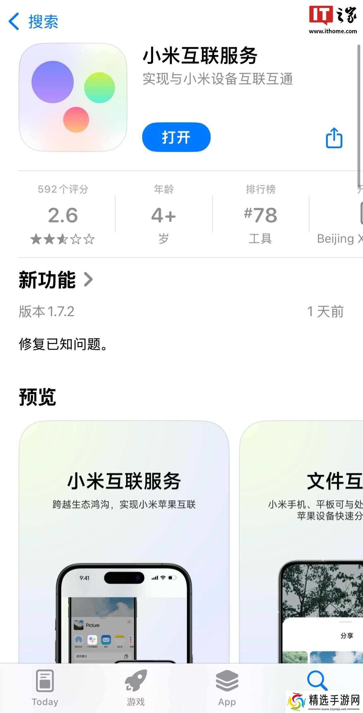 本站 6 月 30 日消息,小米互联服务 App 已于去年 10 月上架苹果 App Store,商店页面显示,该应用支持同账号小米手机和苹果设备互相发现、传输文件。