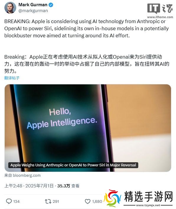 本站 7 月 1 日消息,彭博社记者马克・古尔曼(Mark Gurman)今日发文称:苹果正在考虑放弃其自研内部模型,并已与两家公司就 AI 合作的问题展开讨论。